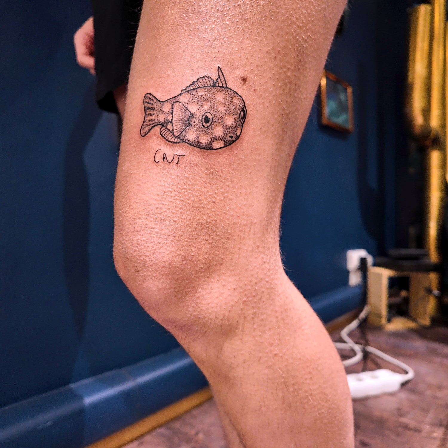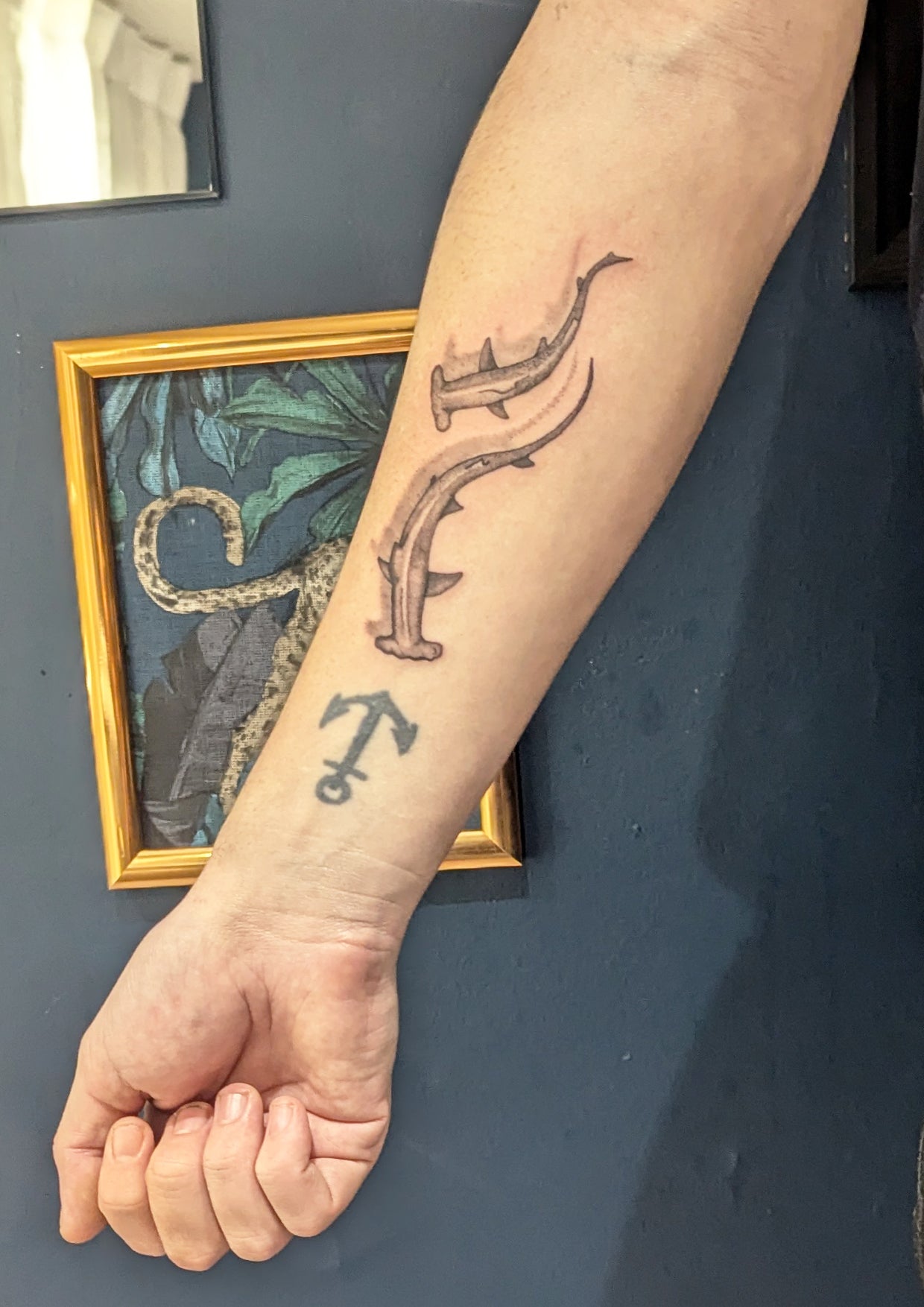 Je privilégie les tatouages fins, en noir, dans un style naturaliste ou symbolique, souvent inspirés par la mer, les poissons, les souvenirs de voyage ou les espèces menacées.