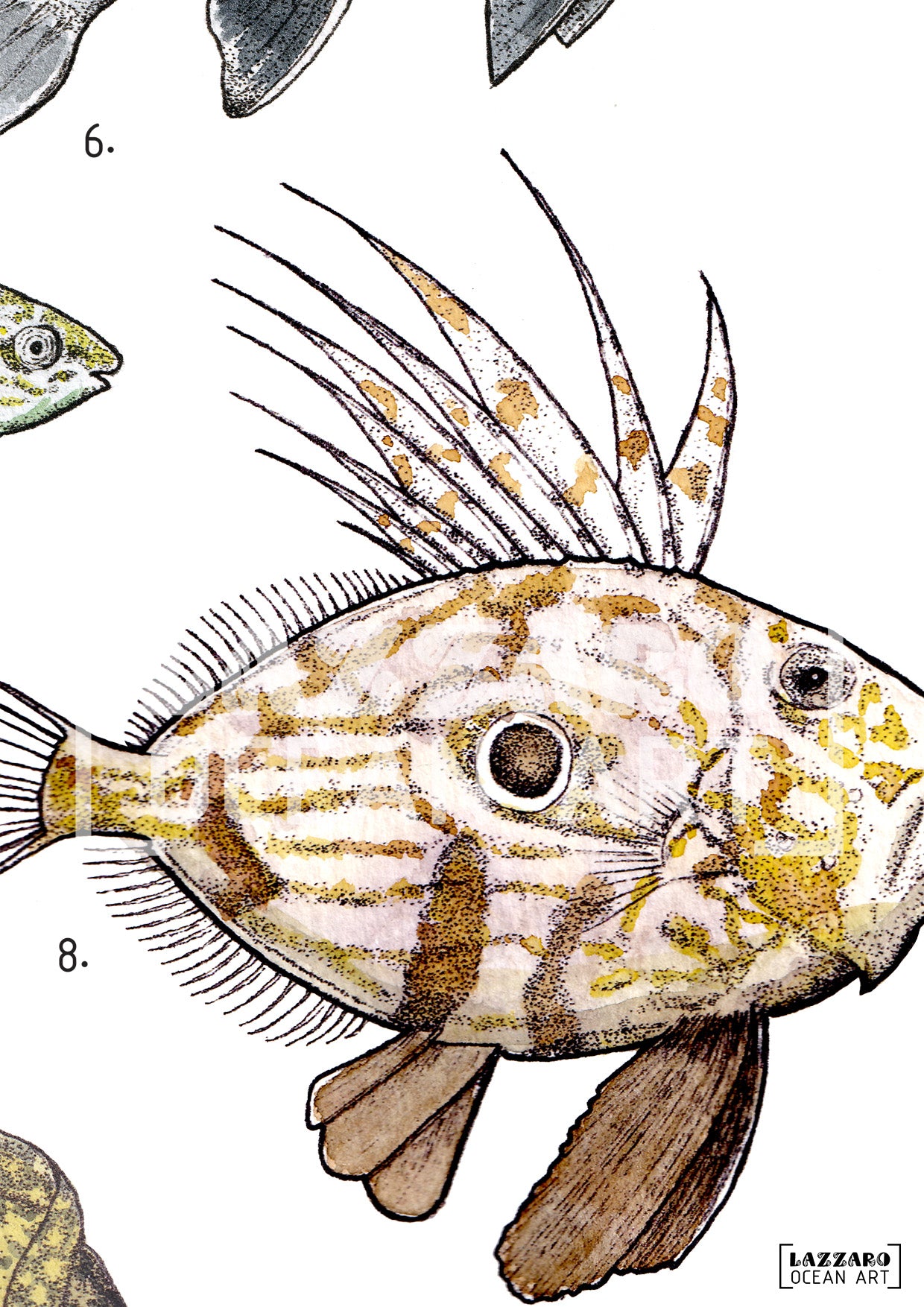 Cette illustration, réalisée à l’encre et à l’aquarelle, met en lumière douze espèces emblématiques de la Méditerranée, un écosystème unique et précieux. Chaque animal est soigneusement dessiné au feutre avec la technique du dotwork, puis délicatement aquarellé, capturant l’essence de la faune sous-marine méditerranéenne.
