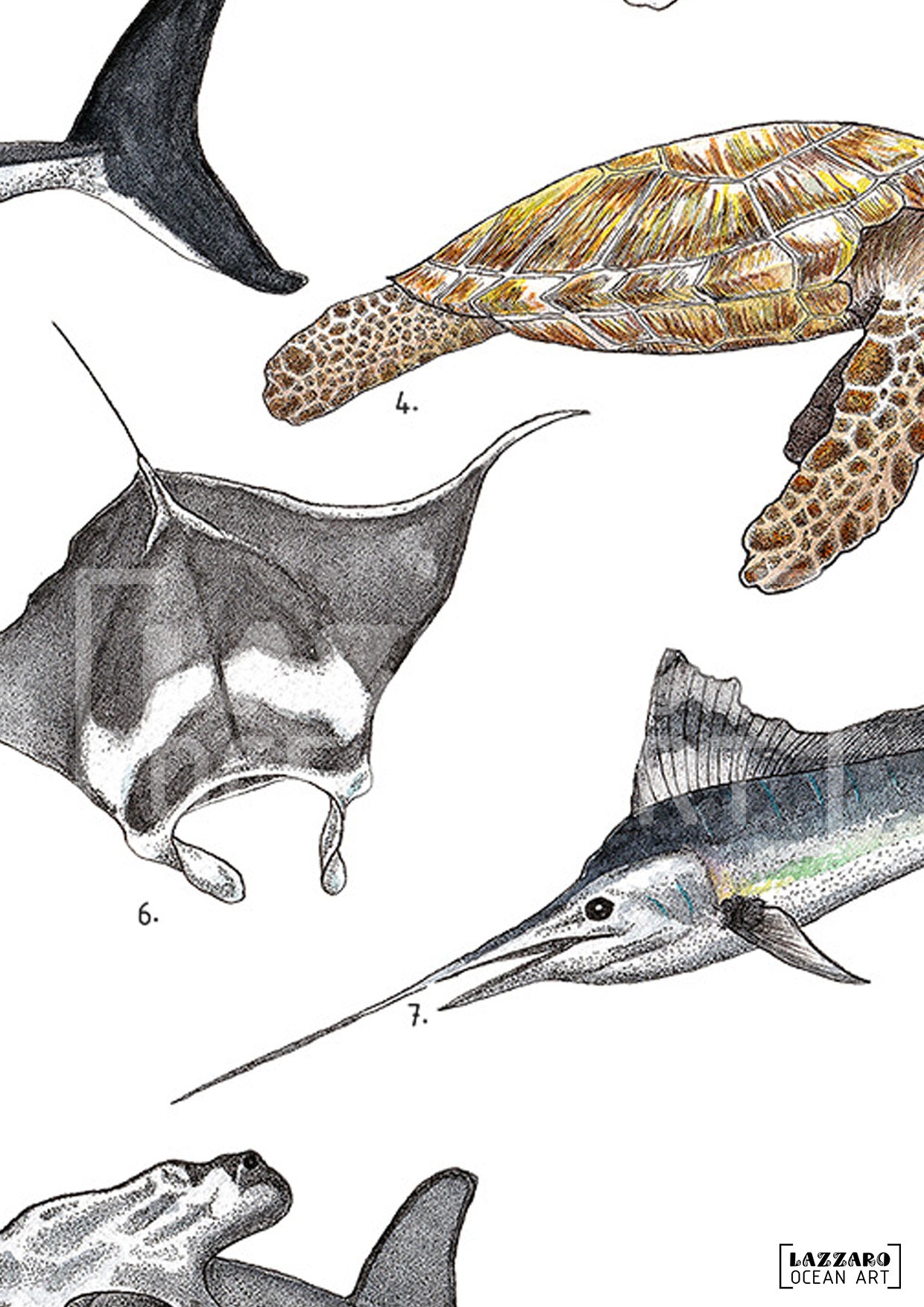 Cette illustration, réalisée à l’encre et à l’aquarelle, rend hommage à neuf créatures marines en voie de disparition. Chaque animal est méticuleusement dessiné à l'encre grâce à la technique du dotwork, puis sublimé par les nuances délicates de l’aquarelle.